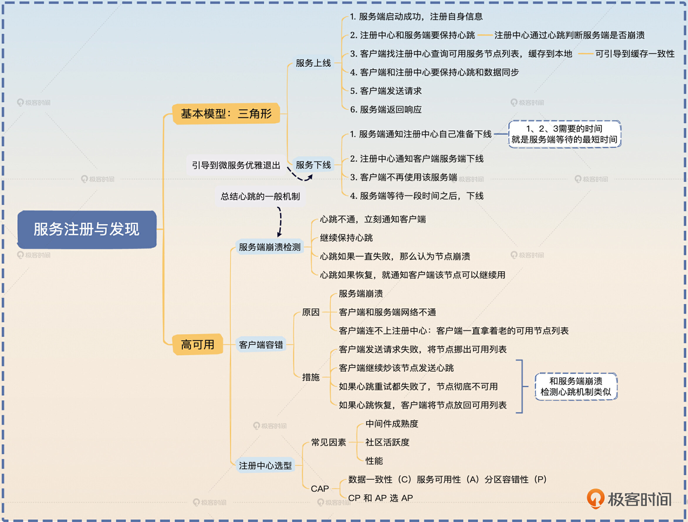 所以这一节课我就要带着你深入剖析服务注册与发现,学习服务注册与发现的基本模型,然后在服务端崩溃检测、客户端容错和注册中心选型三个角度找到高可用微服务架构的亮点。