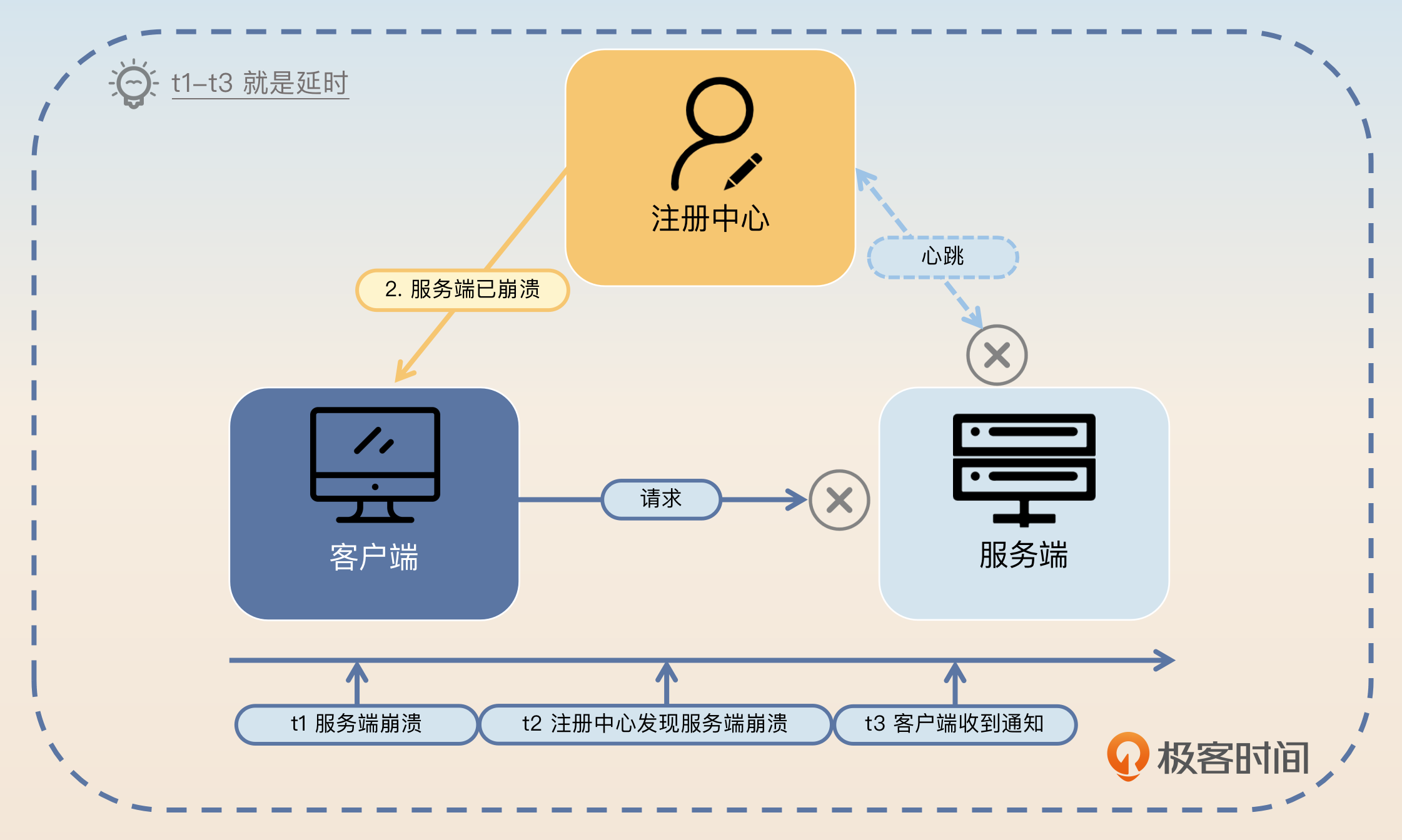 你可能在上面这张图片里注意到了,服务端崩溃之后注册中心和服务端之间的心跳就无法继续保持了。所以你得出一个简单的结论: 如果注册中心和服务端之间的心跳断了,就认为服务端已经崩溃了。